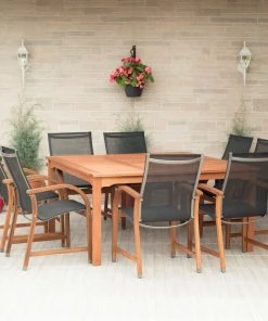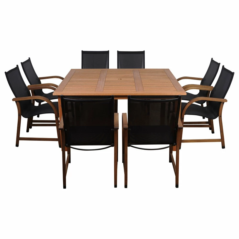 SKU: SC_426_8MANHA Categories: Outdoor Dining Furniture, Outdoor Dining Sets, Outdoor Furniture Tags: Amazonia, Arm, Black, Chair, Dining, Dining set, Eucalyptus, Furniture, Mesh, Modern, Outdoor, Patio, Sling, Square, Wood