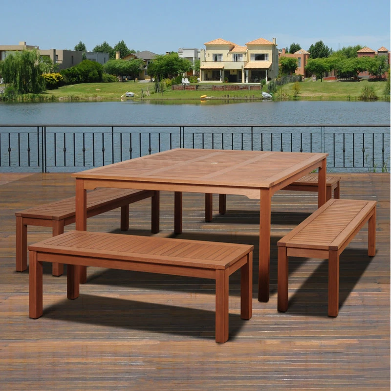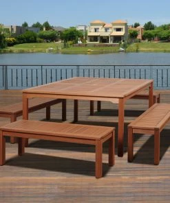 【5-Piece Set】This set includes 4 high quality 100% FSC certified eucalyptus benches and 1 square table. This set is ideal for both indoors and patio and will make your outdoors an elegant space to enjoy with family and friends.