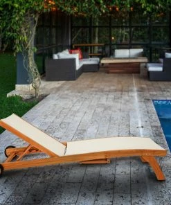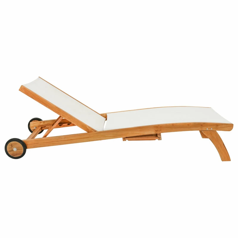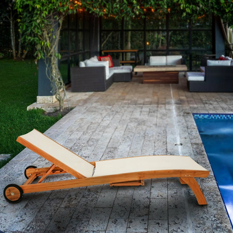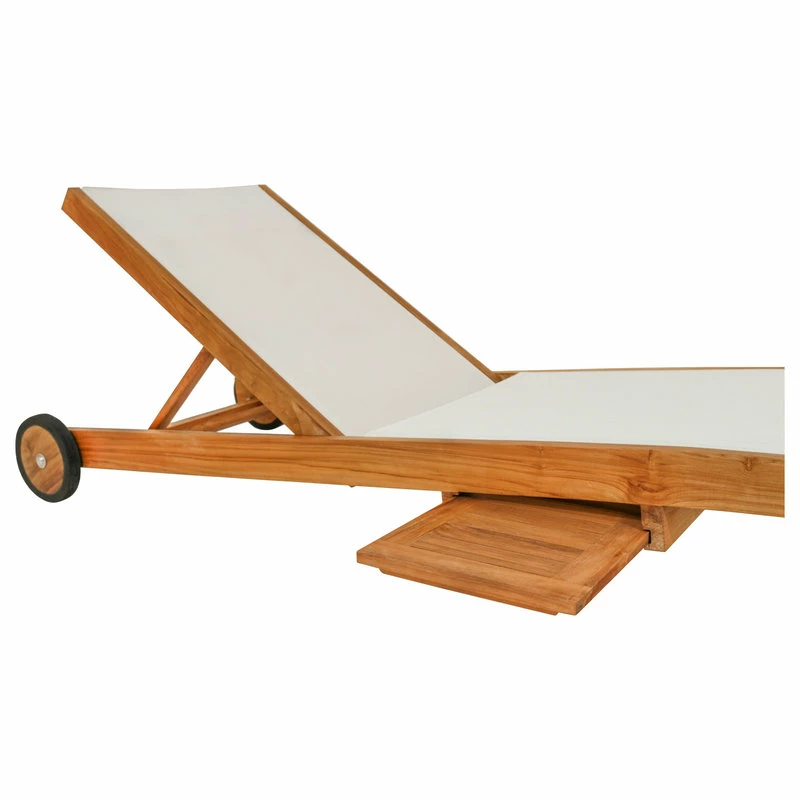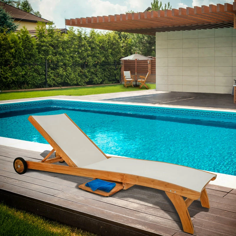 Our Teak Bahama Pool Lounger with Batyline Mesh is one of the sturdiest pieces of poolside furniture you will ever see. This lounger is ideal for soaking up rays in style and comfort. With a pullout tray perfect for holding drinks or your favorite book, as well as adjustable back, you may never even make it into the pool. And with wheels that allow for easy movement, you and your lounger can chase the sun all day.