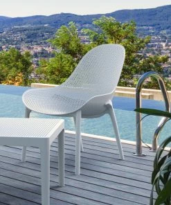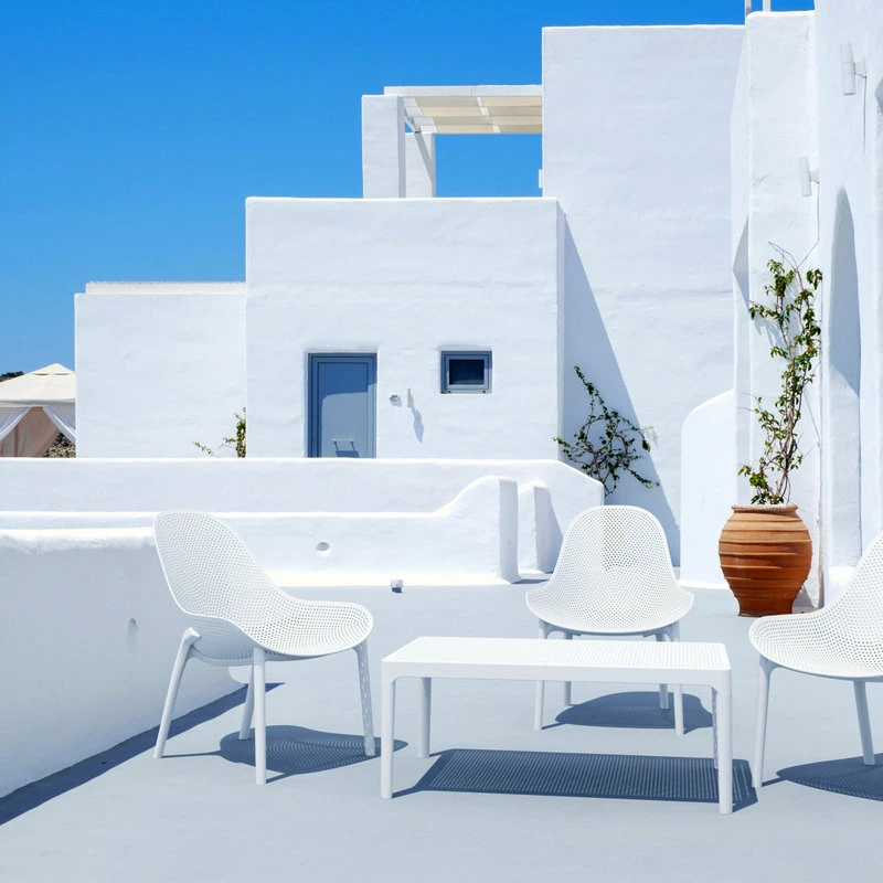Sky lounge chair. Contemporary design. Made from commercial grade resin with gas injection molded legs. Extremely durable for outdoor temperatures. Easy cleaning. Perfect for heavy use indoor outdoor areas.