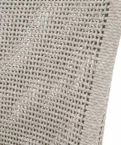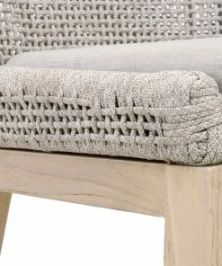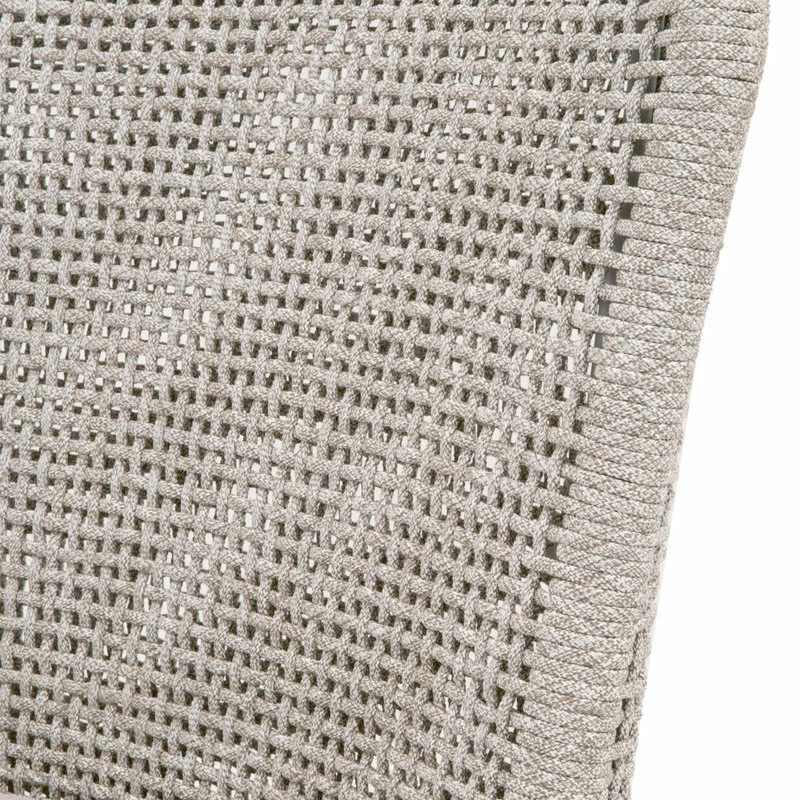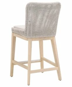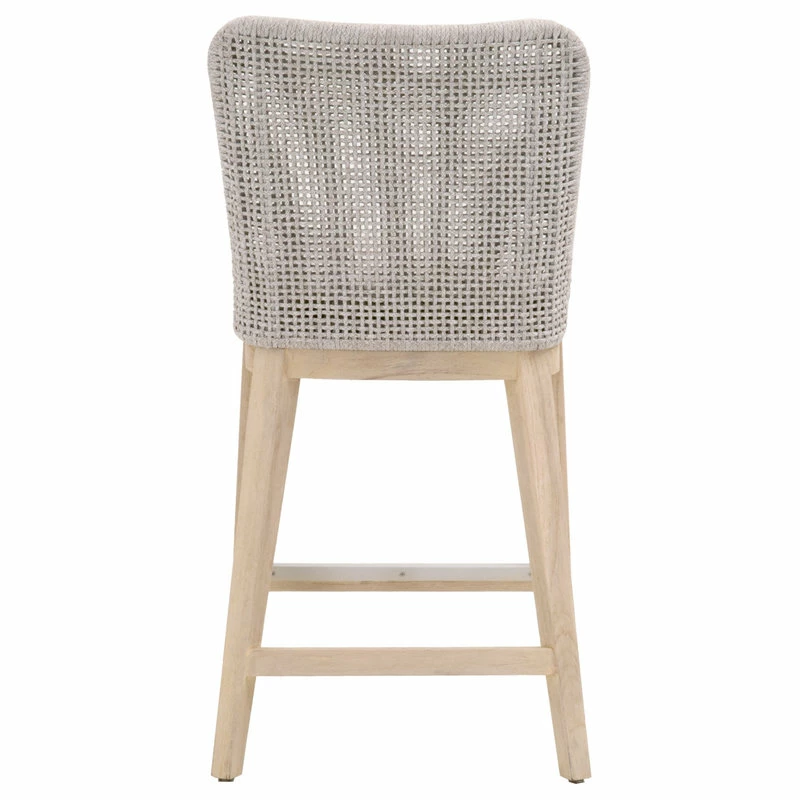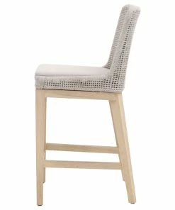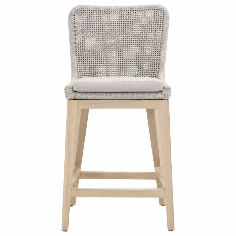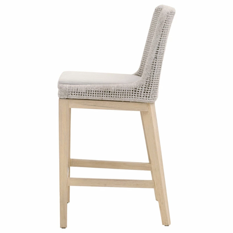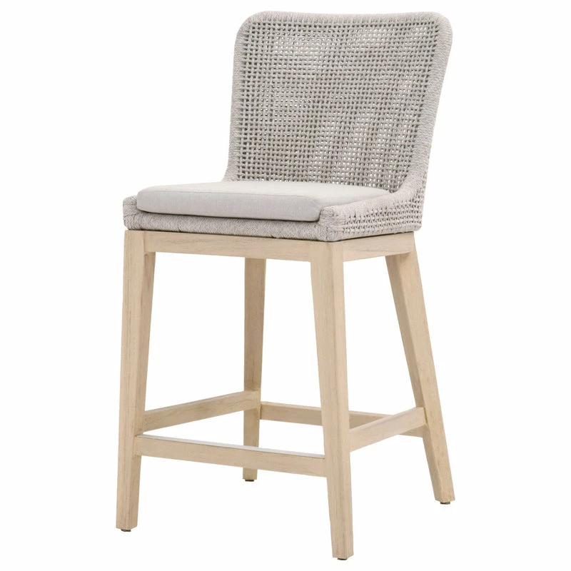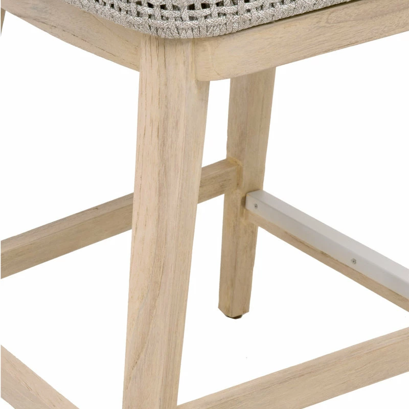 Mesh Outdoor Counter Stool Taupe & White Flat Rope, Gray Teak, Pumice Woven Collection “Gray Teak” is solid teak wood finished with a solution that expedites the aging process of teak to a natural silver tone. Over time, the natural weathering of Gray Teak will cause its appearance to change in color and texture, with possible marks and cracks. By ordering Gray Teak, you accept these characteristics and agree that no claim will be approved regarding the natural aging process of teak or the special color qualities associated with the Gray Teak finish. Special care should be taken to protect this natural finish. Mesh Outdoor Counter Stool Taupe & White Flat Rope, Gray Teak, Pumice Features: