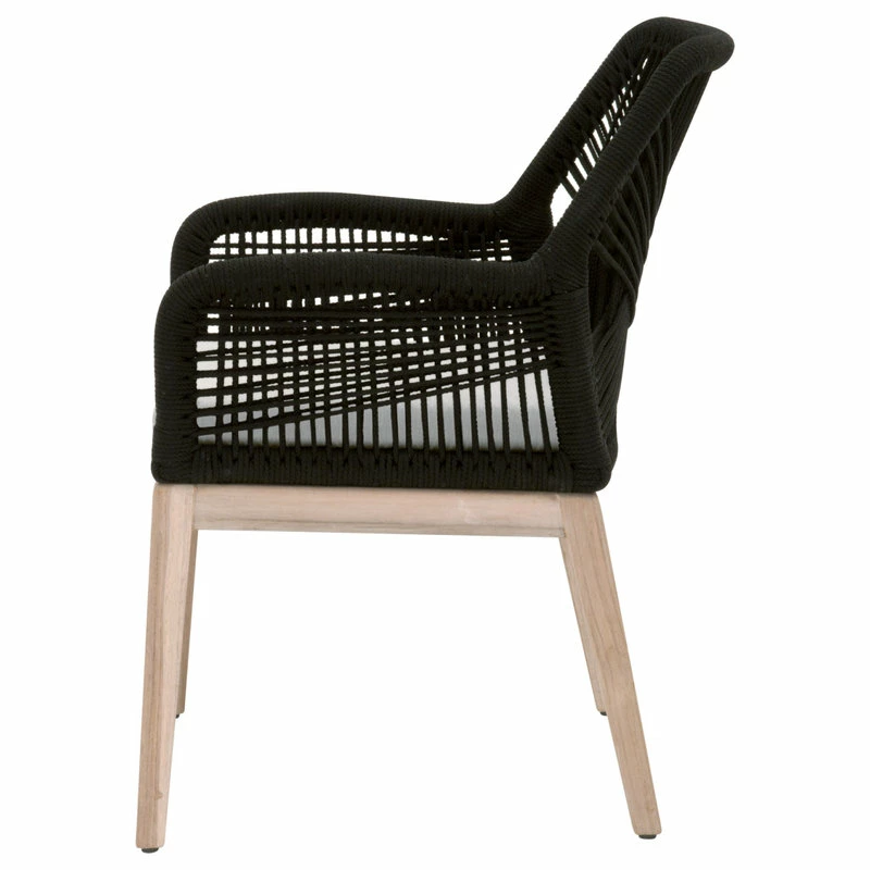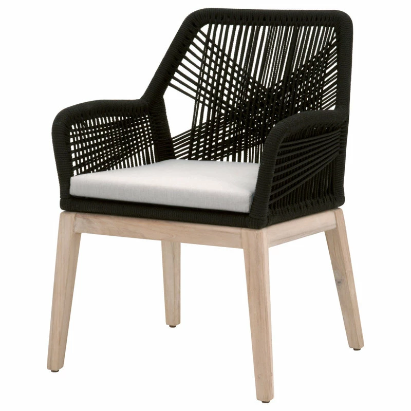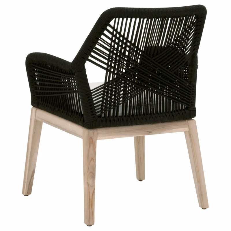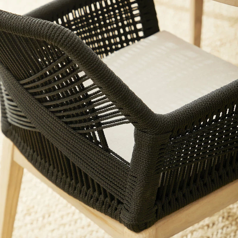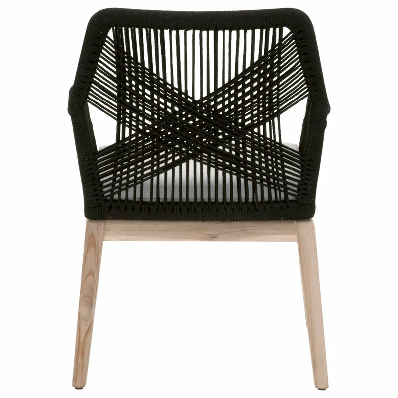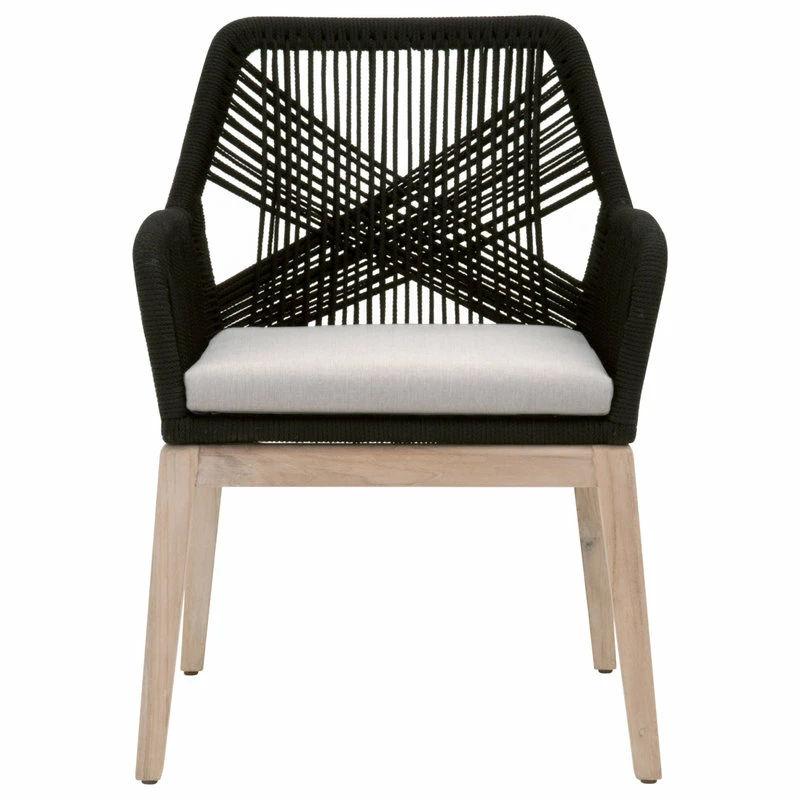 These woven outdoor arm chairs will add a touch of coastal style to your backyard or patio. Constructed with an aluminum frame and solid gray teak legs, these chairs are not only sturdy, but durable for outdoor use. The black colored rope is tightly woven to create a unique loom design, while the gray teak legs have a beautiful wood grain finish. Paired with a removable all-weather seat cushion, the chairs provide comfort with style and will be the perfect addition to any indoor or outdoor space.