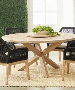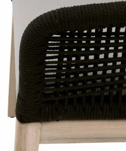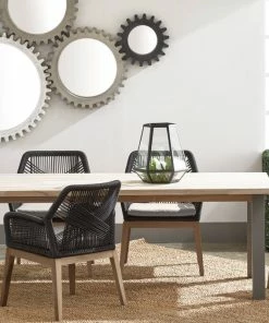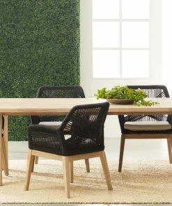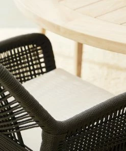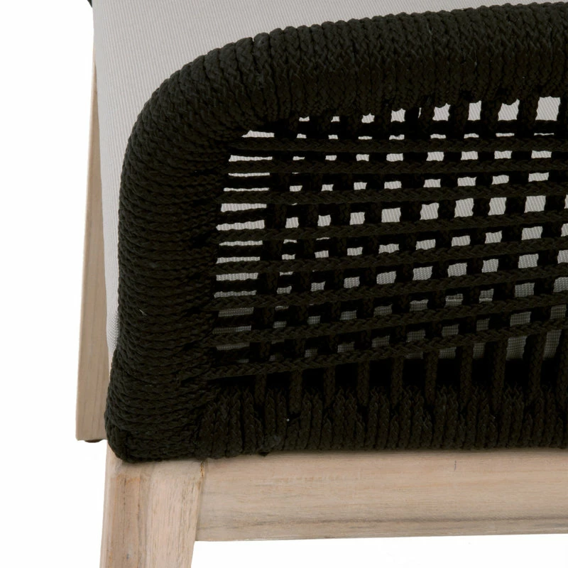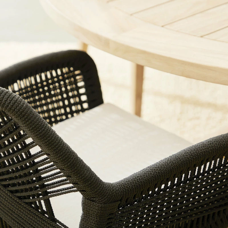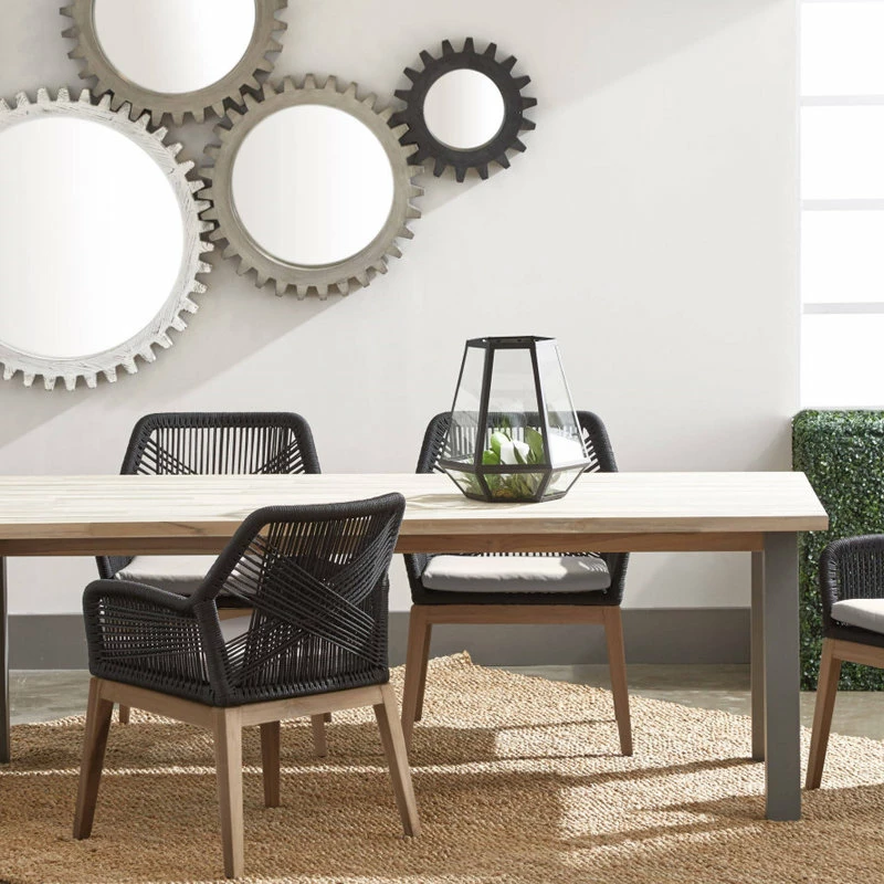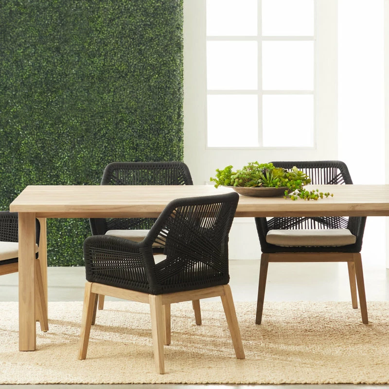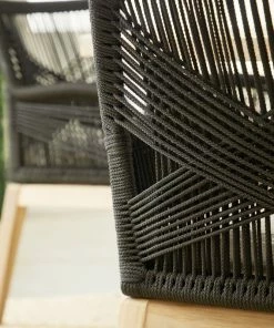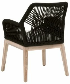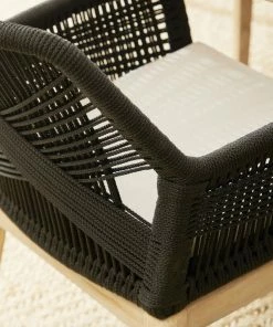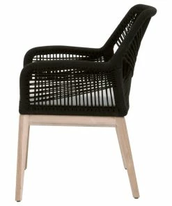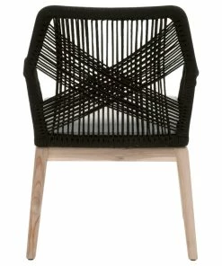 These woven outdoor arm chairs will add a touch of coastal style to your backyard or patio. Constructed with an aluminum frame and solid gray teak legs, these chairs are not only sturdy, but durable for outdoor use. The black colored rope is tightly woven to create a unique loom design, while the gray teak legs have a beautiful wood grain finish. Paired with a removable all-weather seat cushion, the chairs provide comfort with style and will be the perfect addition to any indoor or outdoor space.