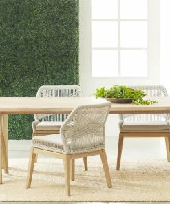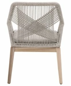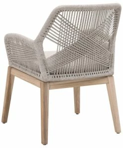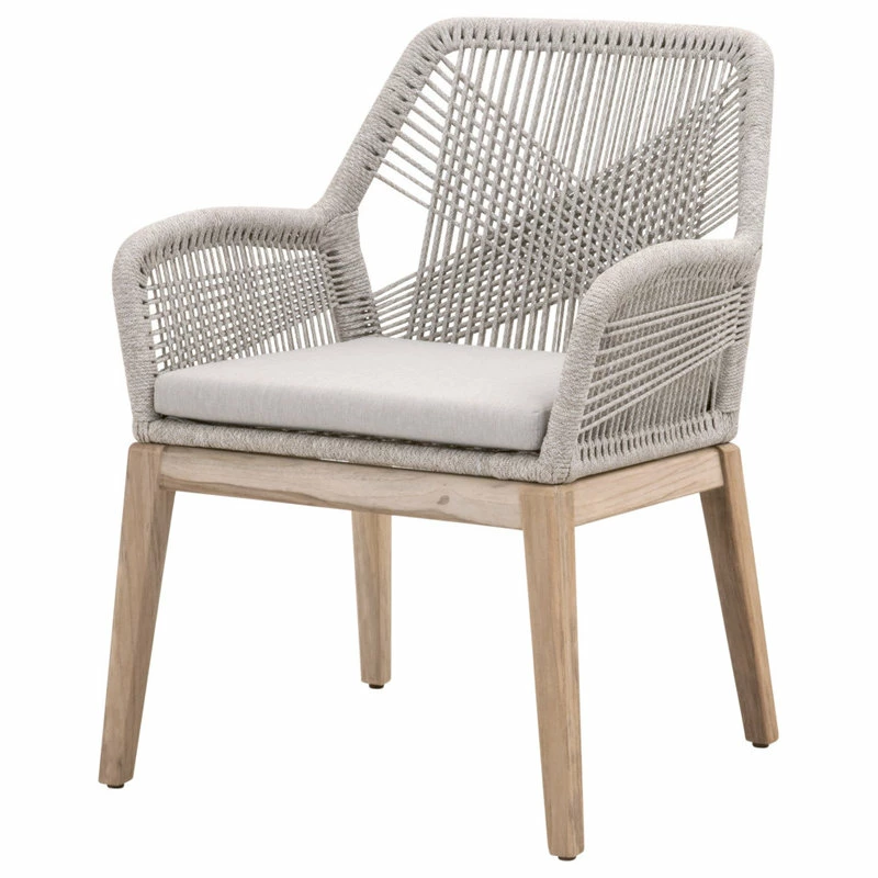 These woven arm chairs will add a touch of coastal style to your kitchen or dining space. Constructed with an aluminum frame and solid mahogany legs, these chairs are not only sturdy, but durable. A rich platinum colored rope is tightly woven to create a unique loom design, while the wood legs have a beautiful distressed Natural Gray finish. Paired with a removable Pumice seat cushion, the chairs provide comfort with style and will be the perfect addition to any transitional or traditional dining room.