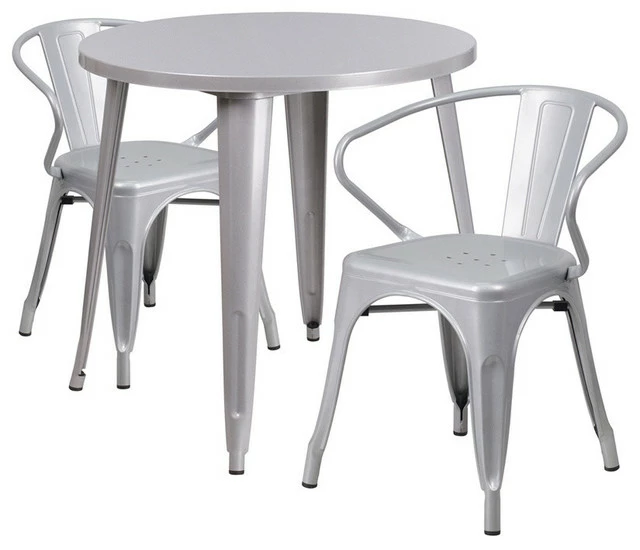 - 30” Round Silver Metal Indoor-Outdoor Table Set with 2 Arm Chairs [CH-51090TH-2-18ARM-SIL-GG] 30″W x 30″D x 29.50″H.