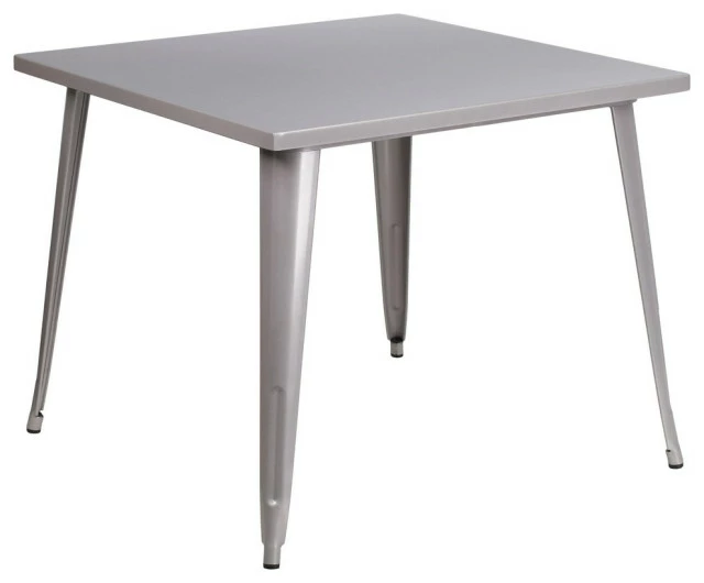 Create a vibrant, energetic dining space with this colorful industrial style silver metal table. This lively table will add a retro-modern look to your home or business. Pair this table with like colored metal chairs for a uniform look or mix things up by adding different colored chairs. A thick brace underneath the top adds extra stability. The legs have protective rubber floor glides that prevent damage to flooring. This all-weather table is great for indoor and outdoor settings. For longevity, care should be taken to protect from long periods of wet weather. Great for both commercial and residential spaces, the decorating possibilities for this table are only limited by your imagination!