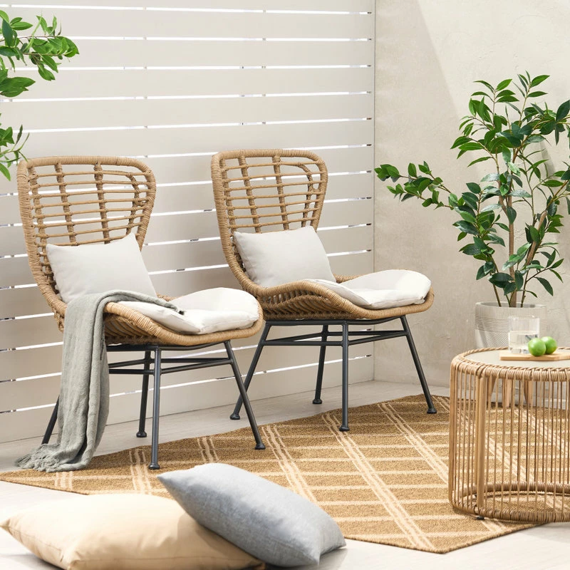 Provide your backyard space with an intimate set up that will uplift small spaces and cozy corners. Our chat set perfectly blends rattan and metal to emphasize its superior excellence and to bring your outdoor space together with a flourish. This set features clean lines and gorgeous modern boho style, providing a stylish flair to your outdoor space while offering a minimalistic yet durable structure. With water-resistant cushions and a rattan rope drum table, our chat set brings perfect styling for all your summer days.