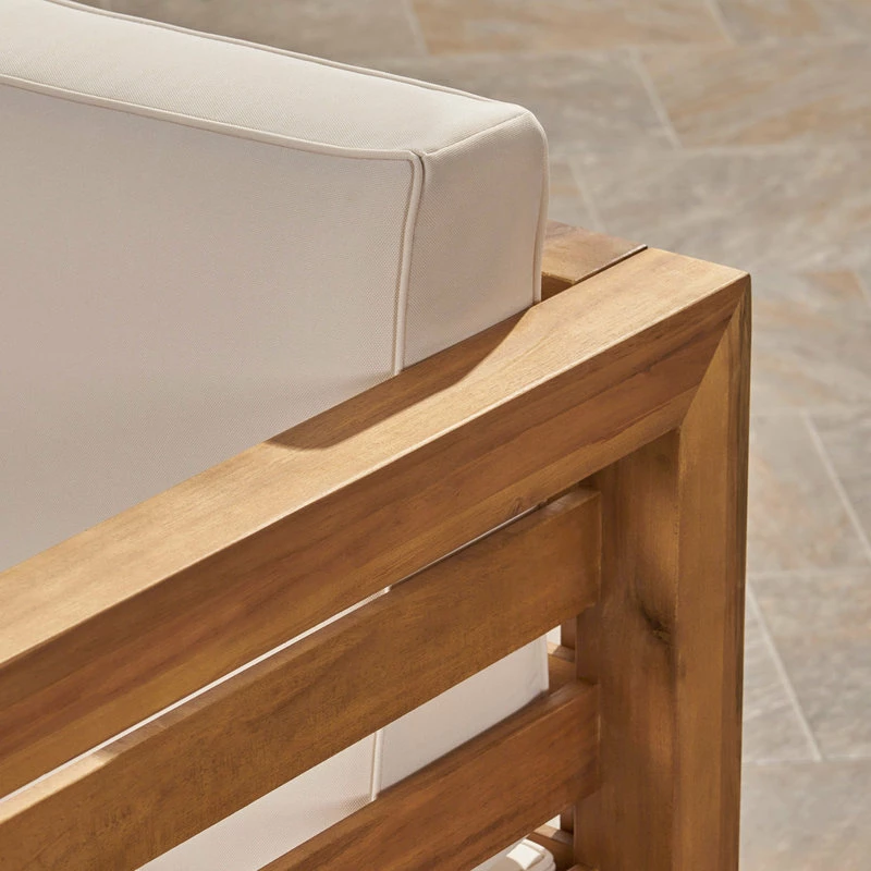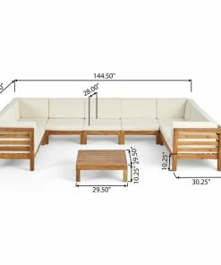 Hosting any summer backyard get-together will be a breeze with our charming sectional sofa set. This conversation set offers a modular design that makes this the ideal centerpiece for any outdoor event. With solid acacia wood frames, plush outdoor cushions, and a slatted coffee table, this sectional can easily seat nine in both comfort and style. This configurable design allows a personalized touch to your lounge space, offering hours of fantastic conversation for you and your guests for years to come.