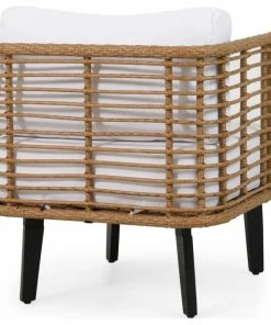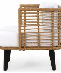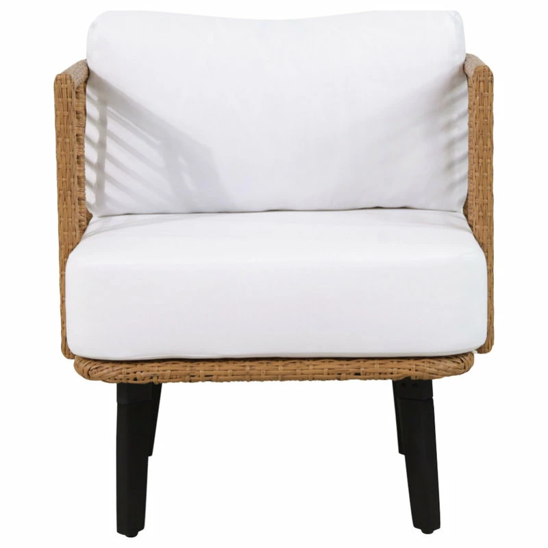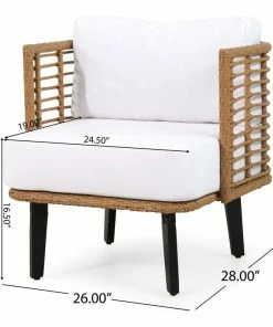 Revamp your outdoor space with seating that gives off a feeling of refreshing comfort and refined charm. Rounded cube seating, a rattan weave finish, and sturdy splayed legs come together to create an incredible masterpiece for your outdoor space. Our club chair brings a sophisticated yet minimalistic structure that has incredible stability and exquisite design. Finished with cozy water-resistant cushions, this chair brings a cozy and timeless look to your outdoor space, giving an undeniably stylish flair to your home.MODERN DESIGN: With clean lines contrasted perfectly by its rounded cube structure, our wicker chair is the ideal modern accessory for your outdoor space. Finished with sturdy tapered legs, this chair not only offers a sleek, minimalistic look but also provides a stable structure.POLYETHYLENE RATTAN: Featuring a long-lasting woven finish, this style is not only incredibly durable but also provides a versatile appearance. The handcrafted details of this material allow this piece to blend seamlessly with your decor.ACACIA WOOD LEGS: Made with acacia wood that brings a sleek and exotic look to your space, this durable hardwood naturally withstands outdoor elements and will not darken over time. Acacia wood is perfect as a solid, heavy frame that resists wear and tear.WATER-RESISTANT CUSHIONS: Our cushions are covered with a non-porous material that makes cleaning any spill a breeze. Please note that these cushions are water-resistant and not waterproof. Please do not submerge in water.DIMENSIONS: Choose an accessory that is the perfect size for you and your furniture. This chair is 26.00″W x 28.00″D x 26.50″H. You will love how much your space can transform with the simple addition of this charming chair.