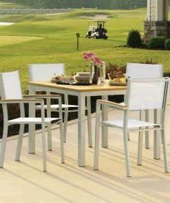 - Tekwood table top and arm caps provide the look of teak with minimal weathering and maintenance
