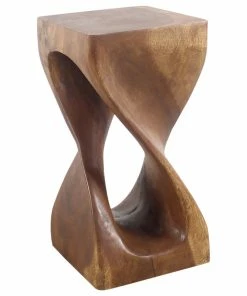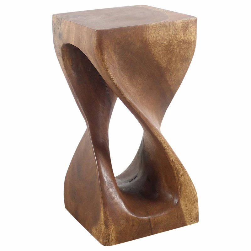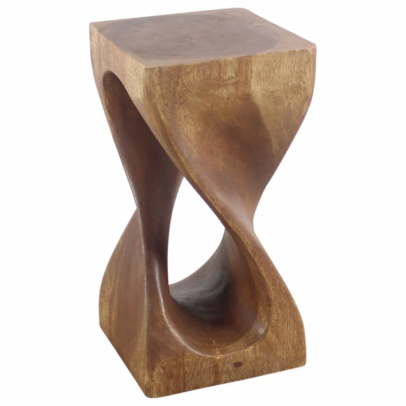 A dual graceful single half twist creating the perfect display stand. The separation in the center of the twist shows off the internal wood grain and structure. Each piece is hand crafted, kiln dried, and elegantly finished to show off the beauty of the natural wood and craftsmanship of the piece. Carved from a single piece of sustainable, lustrous Monkey Pod wood, each Stool or Display Stand is a work of art itself, and can be lit from above or below to show off the unique curves and grain of the piece. At 12 inches square and 23 inches high