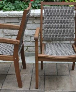 The 3 pc. Sandstone & Eucalyptus Bistro Set with Wicker & Eucalyptus Stacking Armchairs brings mixed material styling to your patio and garden.