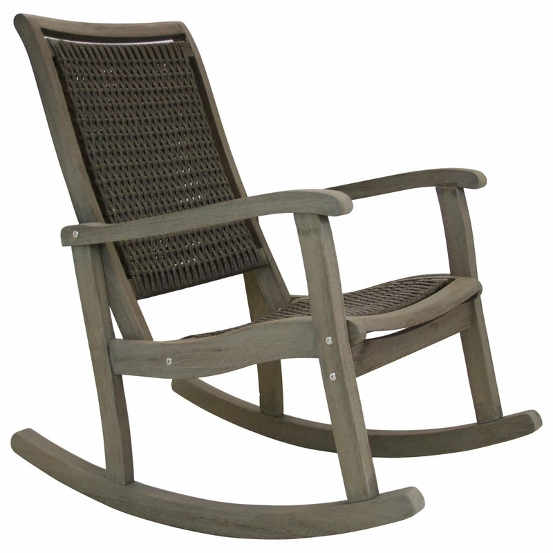 The Outdoor Interiors Grey Wash Eucalyptus & Driftwood Grey Wicker Rocking Chair is made from sustainable, plantation-grown eucalyptus, Stainless steel hardware, and HDPE all-weather wicker for long-lasting outdoor use and exceptional durability. The grey wash texturing process begins with machine and hand brushing to create a grainy texture and vintage look. Three coats of high-quality all-weather stains are applied for an elegant look and feel.