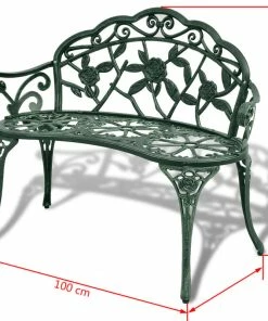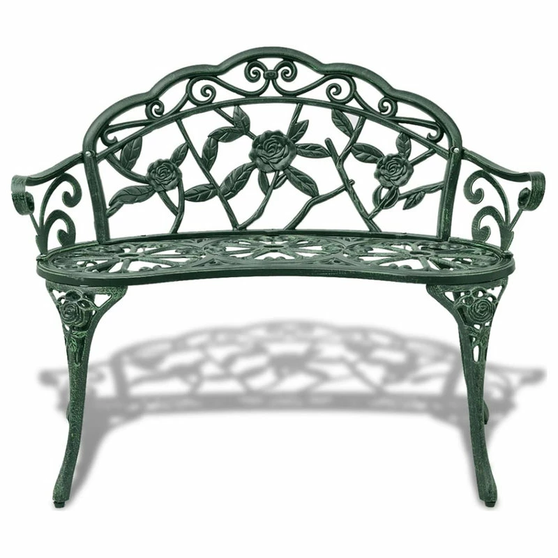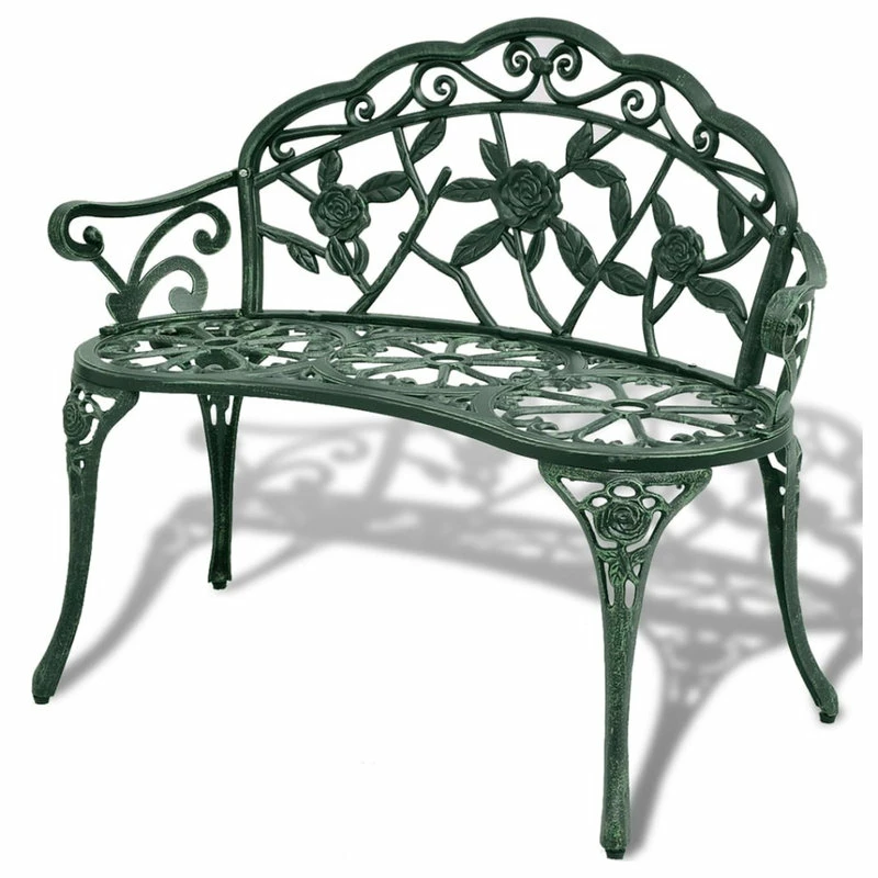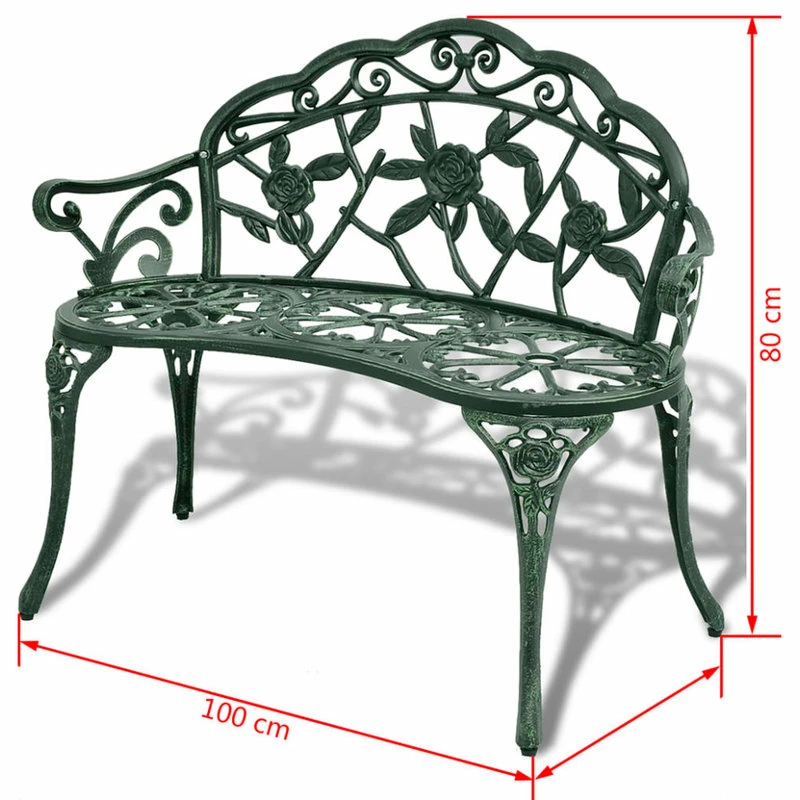- Material: Cast aluminum back/seat/armrest + cast iron legs
